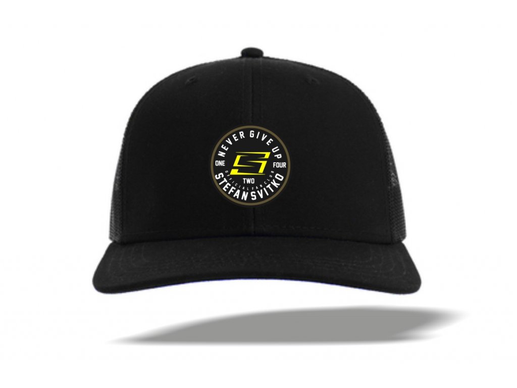 Čierna šiltovka s mierne zaobleným šiltom a dierkovanou zadnou časťou. Okrúhle logo„NEVER GIVE UP“. Nastaviteľná veľkosť.